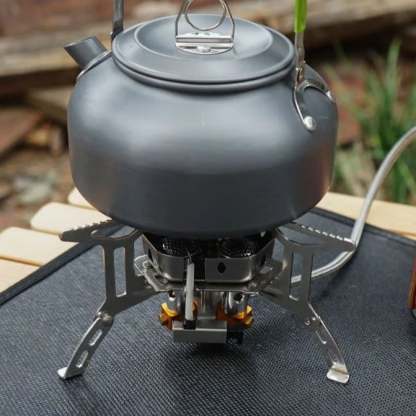 This camping accessory gas stove is made of aluminum alloy and stainless steel. Prevent scratches and corrosion. Has non-slip teeth. It's sturdy and can withstand high temperatures.