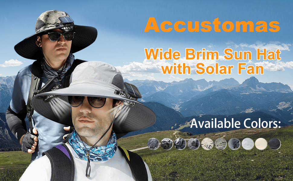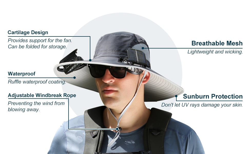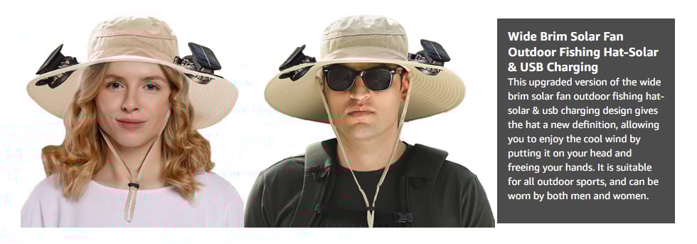 This upgraded outdoor wide brim sun hat with solar fan is designed to be worn on the head, leaving your hands free. Built in a mini fan at the front of the brim, cooling the face.