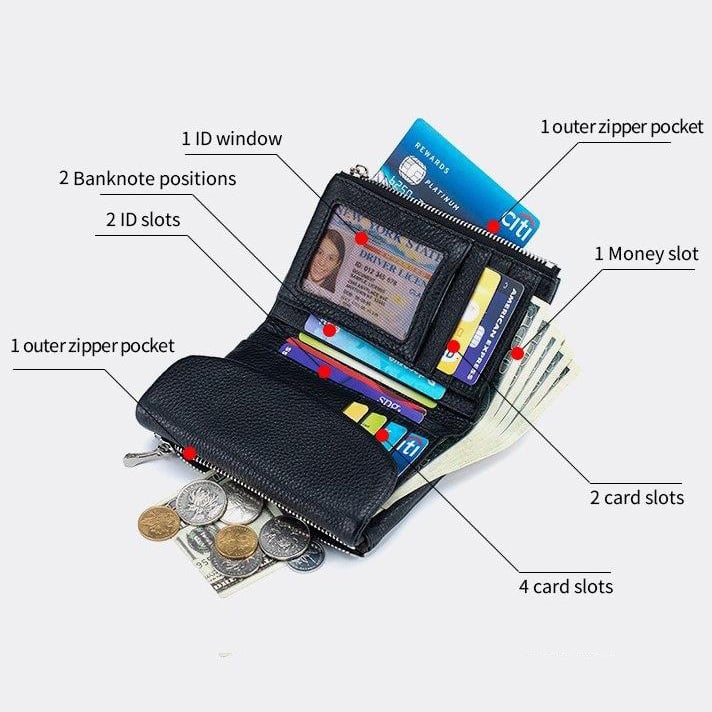 ✨ Smart Structure: 1 large bill slot, 6 card slots, 2 ID windows, 2 zippered coin pockets, and a zipper! All-in-one organization.